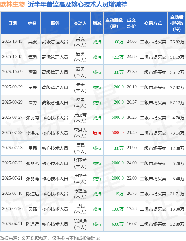 欧林生物近半年内的董监高及核心技术人员增减持详情如下: