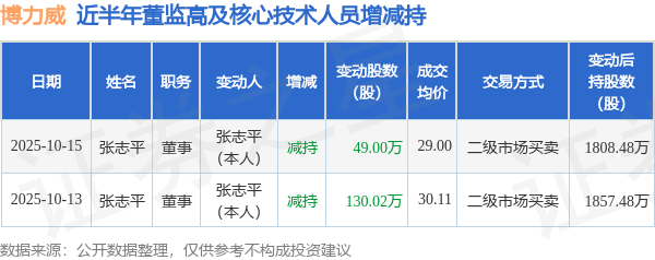 博力威近半年内的董监高及核心技术人员增减持详情如下: