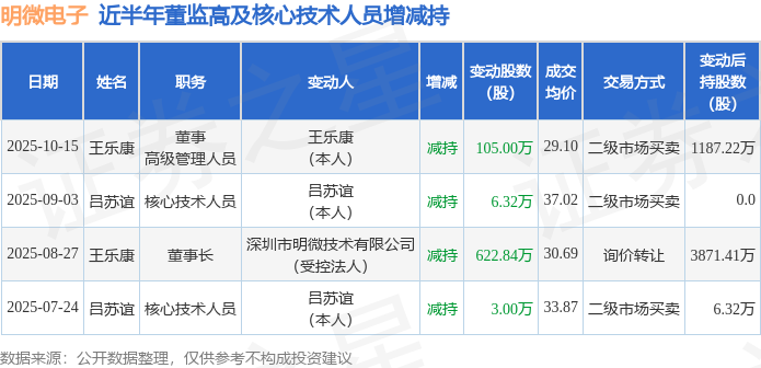 证券之星消息,根据10月16日市场公开信息、上市公司公告及交易所披露数据整理,明微电子(688699)最新董监高及相关人员股份变动情况:2025年10月15日公司董事,高级管理人员王乐康共减持公司股份105.0万股,占公司总股本为0.954%。变动期间公司股价下跌0.25%,10月15日当日收盘报36.29元。