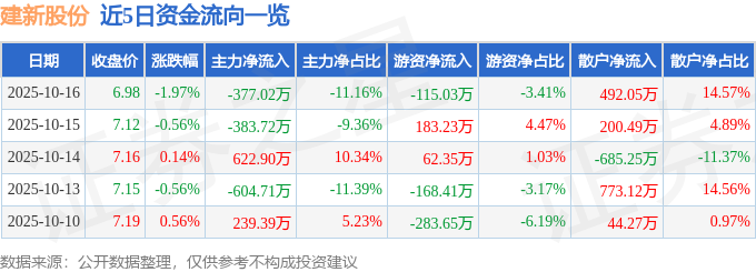 证券之星消息,截至2025年10月16日收盘,建新股份(300107)报收于6.98元,下跌1.97%,换手率1.38%,成交量4.8万手,成交额3377.03万元。