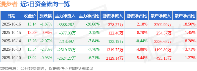 10月16日的资金流向数据方面,主力资金净流出3588.26万元,占总成交额20.68%,游资资金净流入378.27万元,占总成交额2.18%,散户资金净流入3209.99万元,占总成交额18.5%。