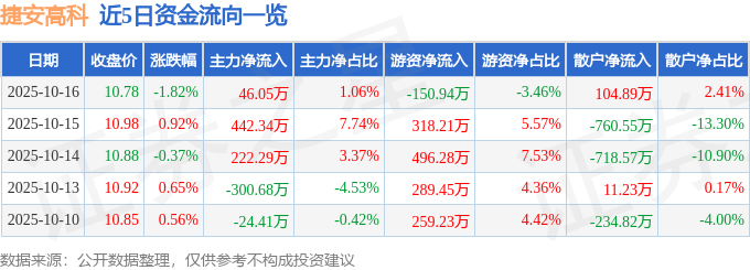 10月16日的资金流向数据方面,主力资金净流入46.05万元,占总成交额1.06%,游资资金净流出150.94万元,占总成交额3.46%,散户资金净流入104.89万元,占总成交额2.41%。