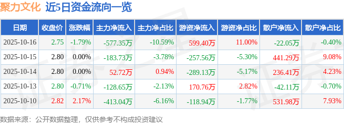 证券之星消息,截至2025年10月16日收盘,聚力文化(002247)报收于2.75元,下跌1.79%,换手率3.06%,成交量19.7万手,成交额5451.05万元。