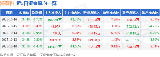 证券之星消息,截至2025年10月16日收盘,海泰科(301022)报收于34.4元,下跌1.77%,换手率3.75%,成交量2.5万手,成交额8653.05万元。