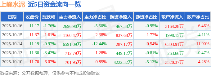 证券之星消息,截至2025年10月16日收盘,上峰水泥(000672)报收于11.17元,下跌1.76%,换手率4.47%,成交量43.38万手,成交额4.9亿元。
