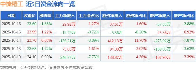 证券之星消息,截至2025年10月16日收盘,中捷精工(301072)报收于23.6元,下跌1.63%,换手率1.47%,成交量9902.0手,成交额2348.67万元。