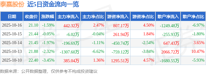 证券之星消息,截至2025年10月16日收盘,泰嘉股份(002843)报收于21.1元,下跌1.59%,换手率3.34%,成交量8.38万手,成交额1.79亿元。