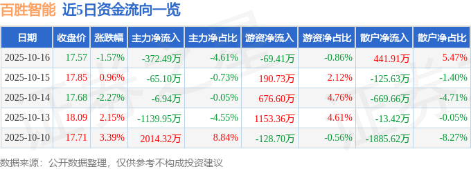证券之星消息,截至2025年10月16日收盘,百胜智能(301083)报收于17.57元,下跌1.57%,换手率5.32%,成交量4.55万手,成交额8085.35万元。