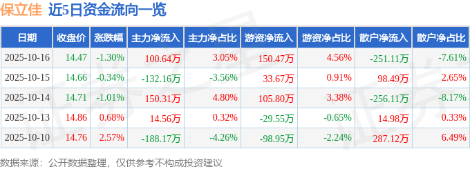 证券之星消息,截至2025年10月16日收盘,保立佳(301037)报收于14.47元,下跌1.3%,换手率3.34%,成交量2.27万手,成交额3297.98万元。