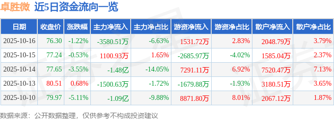 10月16日的资金流向数据方面,主力资金净流出3580.51万元,占总成交额6.63%,游资资金净流入1531.72万元,占总成交额2.83%,散户资金净流入2048.79万元,占总成交额3.79%。