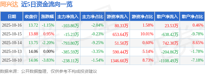 10月16日的资金流向数据方面,主力资金净流出103.86万元,占总成交额2.04%,游资资金净流入80.33万元,占总成交额1.58%,散户资金净流入23.53万元,占总成交额0.46%。