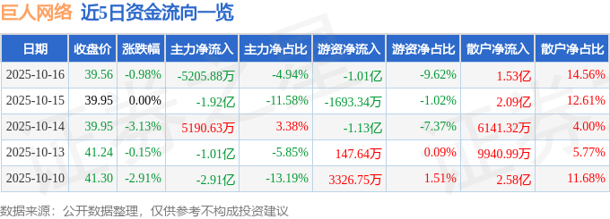 证券之星消息,截至2025年10月16日收盘,巨人网络(002558)报收于39.56元,下跌0.98%,换手率1.37%,成交量26.55万手,成交额10.54亿元。