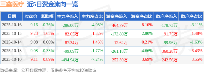 证券之星消息,截至2025年10月16日收盘,三鑫医疗(300453)报收于9.16元,下跌0.76%,换手率1.72%,成交量6.22万手,成交额5738.85万元。