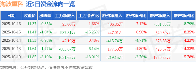 10月16日的资金流向数据方面,主力资金净流入95.0万元,占总成交额1.66%,游资资金净流入406.86万元,占总成交额7.12%,散户资金净流出501.85万元,占总成交额8.79%。