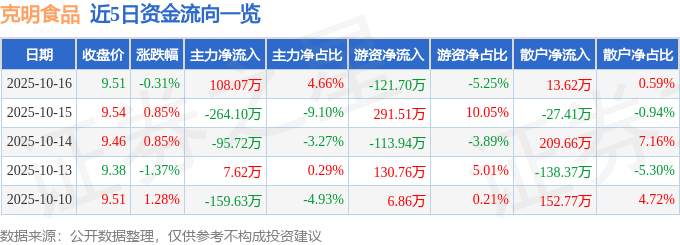 证券之星消息,截至2025年10月16日收盘,克明食品(002661)报收于9.51元,下跌0.31%,换手率0.77%,成交量2.44万手,成交额2319.01万元。