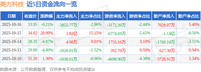 证券之星消息,截至2025年10月16日收盘,美力科技(300611)报收于33.95元,下跌0.21%,换手率25.96%,成交量38.5万手,成交额13.02亿元。