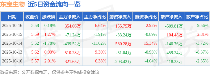证券之星消息,截至2025年10月16日收盘,东宝生物(300239)报收于5.58元,下跌0.18%,换手率1.62%,成交量9.54万手,成交额5335.23万元。