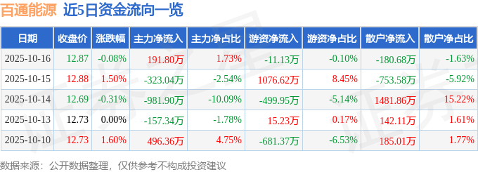 证券之星消息,截至2025年10月16日收盘,百通能源(001376)报收于12.87元,下跌0.08%,换手率4.02%,成交量8.59万手,成交额1.11亿元。