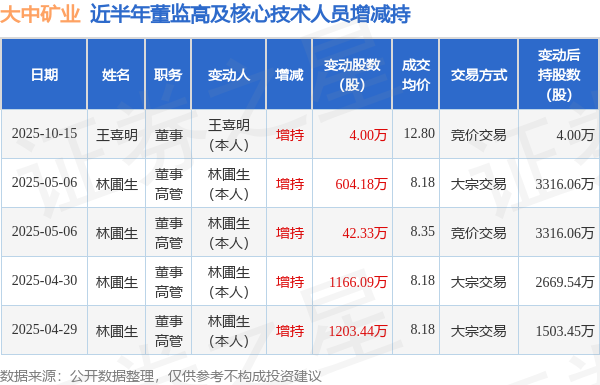 大中矿业近半年内的董监高及核心技术人员增减持详情如下: