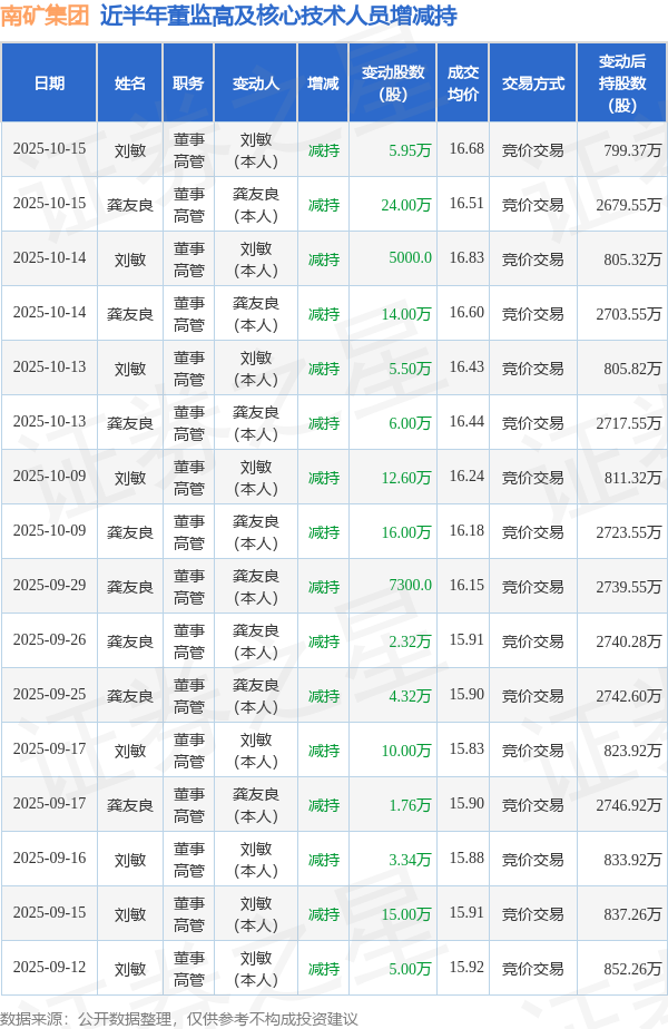 证券之星消息,根据10月16日市场公开信息、上市公司公告及交易所披露数据整理,南矿集团(001360)最新董监高及相关人员股份变动情况:2025年10月15日公司董事,高管龚友良、董事,高管刘敏共减持公司股份29.95万股,占公司总股本为0.1468%。变动期间公司股价上涨2.17%,10月15日当日收盘报16.48元。