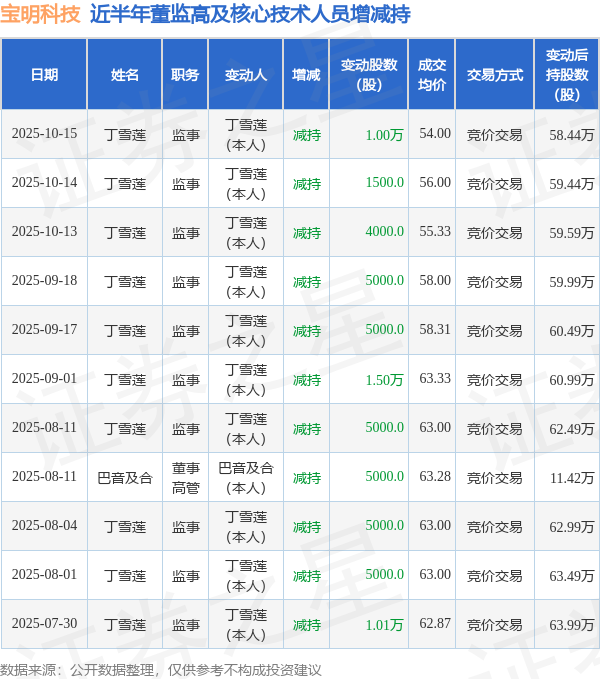 宝明科技近半年内的董监高及核心技术人员增减持详情如下: