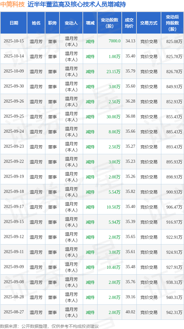 中简科技近半年内的董监高及核心技术人员增减持详情如下: