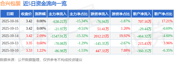 证券之星消息,截至2025年10月16日收盘,合兴包装(002228)报收于3.42元,上涨0.0%,换手率0.99%,成交量12.03万手,成交额4109.41万元。