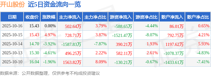 证券之星消息,截至2025年10月16日收盘,开山股份(300257)报收于15.43元,上涨0.0%,换手率0.9%,成交量8.6万手,成交额1.33亿元。