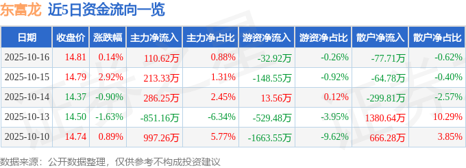 10月16日的资金流向数据方面,主力资金净流入110.62万元,占总成交额0.88%,游资资金净流出32.92万元,占总成交额0.26%,散户资金净流出77.71万元,占总成交额0.62%。