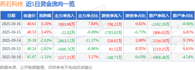 证券之星消息,截至2025年10月16日收盘,药石科技(300725)报收于40.61元,上涨0.2%,换手率2.94%,成交量5.95万手,成交额2.43亿元。