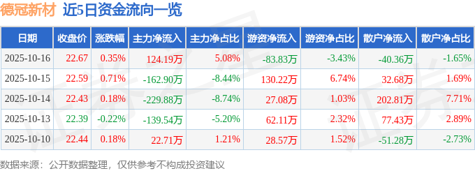 10月16日的资金流向数据方面,主力资金净流入124.19万元,占总成交额5.08%,游资资金净流出83.83万元,占总成交额3.43%,散户资金净流出40.36万元,占总成交额1.65%。