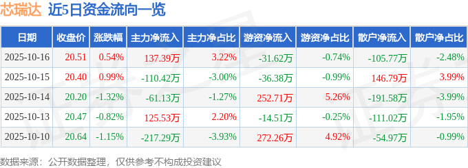 证券之星消息,截至2025年10月16日收盘,芯瑞达(002983)报收于20.51元,上涨0.54%,换手率1.62%,成交量2.08万手,成交额4262.72万元。