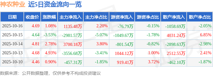 证券之星消息,截至2025年10月16日收盘,神农种业(300189)报收于4.69元,上涨1.08%,换手率12.41%,成交量109.96万手,成交额5.16亿元。