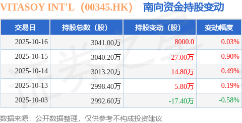 证券之星消息,10月16日南向资金增持8000.0股VITASOY INT'L(00345.HK)。近5个交易日中,获南向资金增持的有4天,累计净增持31.0万股。近20个交易日中,获南向资金增持的有17天,累计净增持311.6万股。截至目前,南向资金持有VITASOY INT'L(00345.HK)3041.0万股,占公司已发行普通股的2.89%。