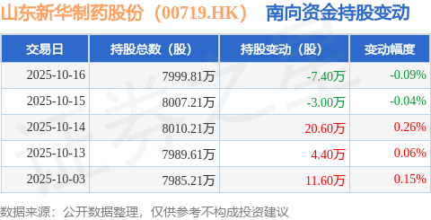 证券之星消息,10月16日南向资金减持7.4万股山东新华制药股份(00719.HK)。近5个交易日中,获南向资金增持的有3天,累计净增持26.2万股。近20个交易日中,获南向资金减持的有12天,累计净减持28.0万股。截至目前,南向资金持有山东新华制药股份(00719.HK)7999.81万股,占公司已发行普通股的41.01%。