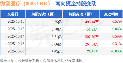 证券之星消息,10月16日南向资金增持495.14万股微创医疗(00853.HK)。近5个交易日中,获南向资金增持的有3天,累计净增持1139.44万股。近20个交易日中,获南向资金增持的有12天,累计净增持4866.2万股。截至目前,南向资金持有微创医疗(00853.HK)8.75亿股,占公司已发行普通股的45.75%。