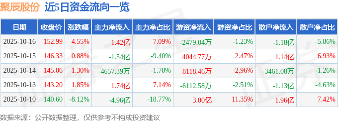 证券之星消息,截至2025年10月16日收盘,聚辰股份(688123)报收于152.99元,上涨4.55%,换手率8.22%,成交量13.02万手,成交额20.08亿元。