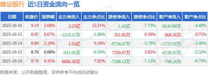 证券之星消息,截至2025年10月16日收盘,建设银行(601939)报收于9.19元,上涨2.68%,换手率2.11%,成交量202.01万手,成交额18.41亿元。