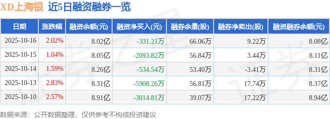 XD上海银融资融券信息显示,融资方面,当日融资买入5149.9万元,融资偿还5481.11万元,融资净偿还331.21万元。融券方面,融券卖出13.02万股,融券偿还3.8万股,融券余量66.06万股,融券余额633.52万元。融资融券余额8.08亿元。