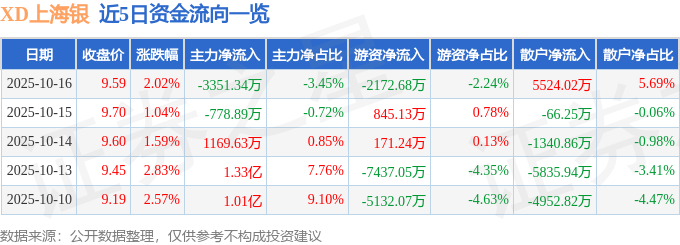 证券之星消息,截至2025年10月16日收盘,XD上海银(601229)报收于9.59元,上涨2.02%,换手率0.72%,成交量101.9万手,成交额9.7亿元。