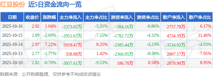 证券之星消息,截至2025年10月16日收盘,红豆股份(600400)报收于2.92元,上涨1.04%,换手率6.52%,成交量149.33万手,成交额4.47亿元。
