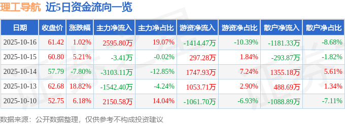 证券之星消息,截至2025年10月16日收盘,理工导航(688282)报收于61.42元,上涨1.02%,换手率2.56%,成交量2.25万手,成交额1.36亿元。