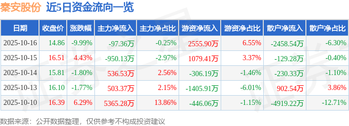 证券之星消息,截至2025年10月16日收盘,秦安股份(603758)报收于14.86元,下跌9.99%,换手率5.71%,成交量25.07万手,成交额3.9亿元。