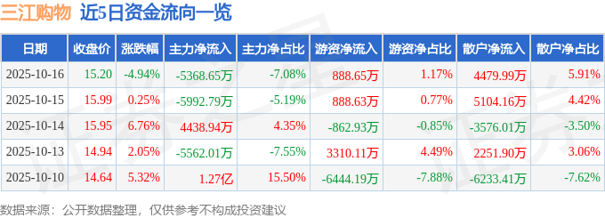 证券之星消息,截至2025年10月16日收盘,三江购物(601116)报收于15.2元,下跌4.94%,换手率8.91%,成交量48.81万手,成交额7.58亿元。