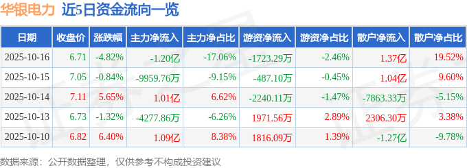 证券之星消息,截至2025年10月16日收盘,华银电力(600744)报收于6.71元,下跌4.82%,换手率5.06%,成交量102.79万手,成交额7.01亿元。