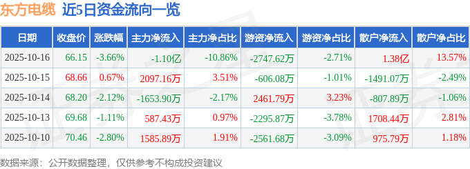 证券之星消息,截至2025年10月16日收盘,东方电缆(603606)报收于66.15元,下跌3.66%,换手率2.21%,成交量15.18万手,成交额10.15亿元。