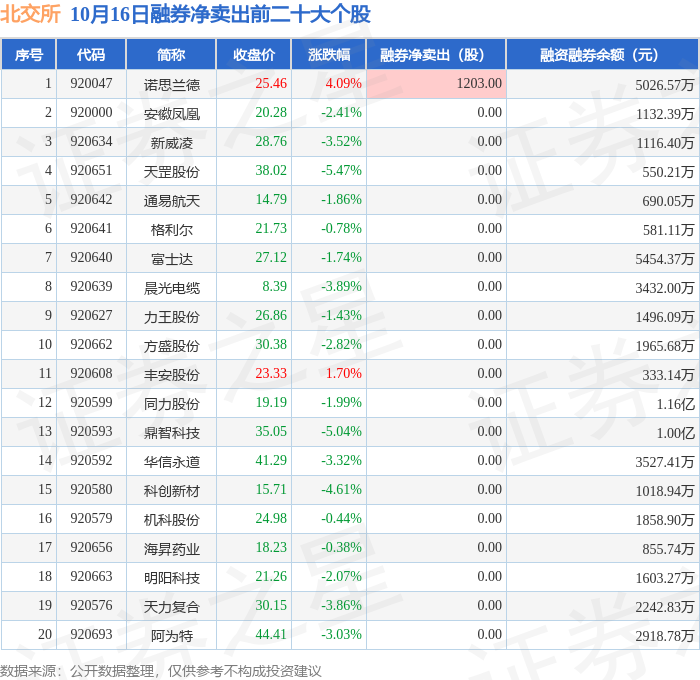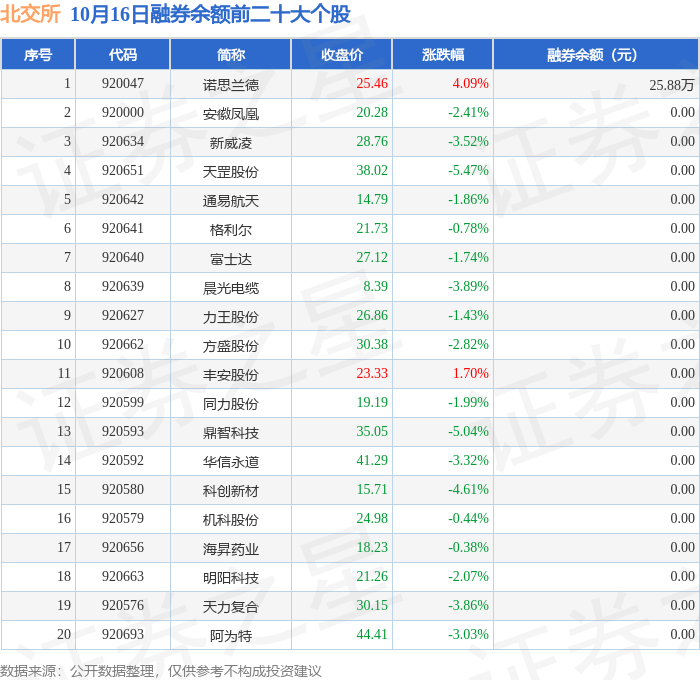 北交所融券余额前三分别为:诺思兰德(920047)融券余额25.88万元,前20具体见下表: