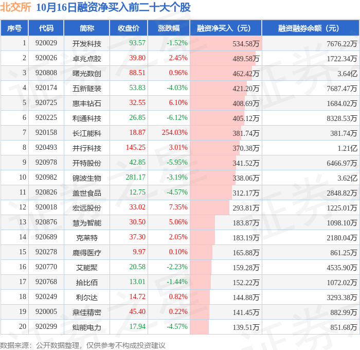 北交所融资净买入前三分别为:开发科技(920029)融资净买入534.58万元、卓兆点胶(920026)融资净买入489.58万元、曙光数创(920808)融资净买入462.42万元,前20具体见下表: