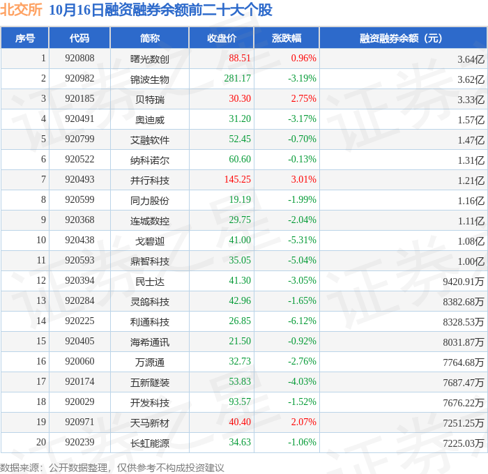 北交所融资融券余额前三分别为:曙光数创(920808)融资融券余额3.64亿元、锦波生物(920982)融资融券余额3.62亿元、贝特瑞(920185)融资融券余额3.33亿元,前20具体见下表: