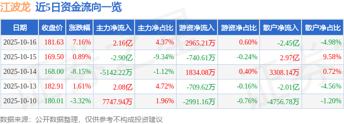 10月16日的资金流向数据方面,主力资金净流入2.16亿元,占总成交额4.37%,游资资金净流入2965.21万元,占总成交额0.6%,散户资金净流出2.45亿元,占总成交额4.98%。